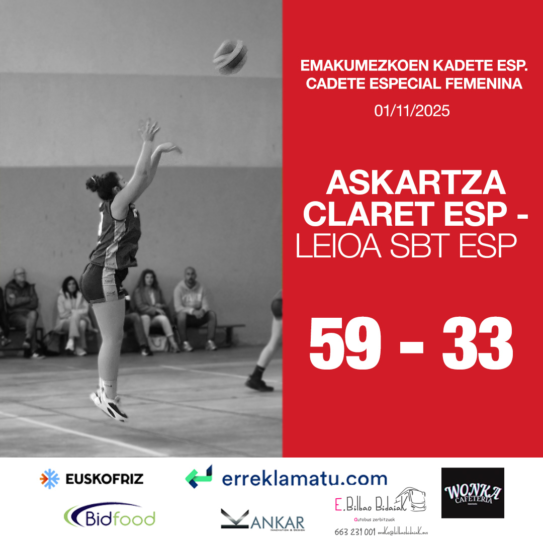 El pasado sábado 1 de noviembre, en el Aterpe de Askartza, nuestro equipo Cadete Femenino Especial consiguió una importante y trabajada victoria frente al Leioa SBT por un contundente 59-33.